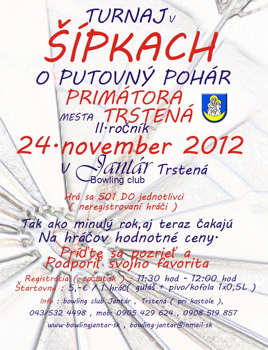 V sobotu 24. novembra 2012 sa uskutoční II. ročník turnaja v šípkach " O putovný pohár primátora mesta Trstená ". Turnaj sa odohrá v Jantár Bowling clube v Trstenej. Jedná sa o turnaj neregistrovaných hráčov SŠF - jednotlivcov a bude sa hrať 501 D.O..